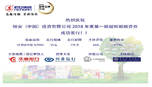 8月30日,尊龙时凯(中国)投资有限公司发行2018年度第一期超短期融资券,发行金额10亿元,期限为270天,主体评级AAA。最终发行价格4.15%,全场申购22.8亿,申购比2.28倍。